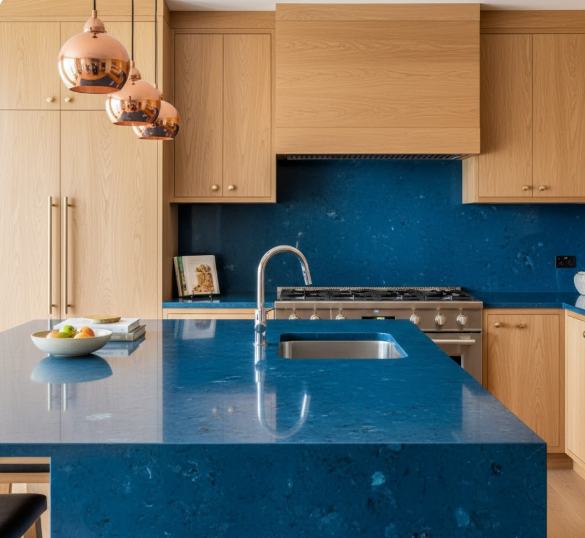 For an integrated look, opt for blue quartz worktops with navy or coordinating blue cabinets. This approach leads to a monochromatic design that feels deep and rich. Incorporate metallic hardware and light-coloured backsplashes to keep things from feeling overly dark.